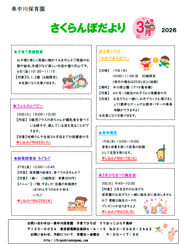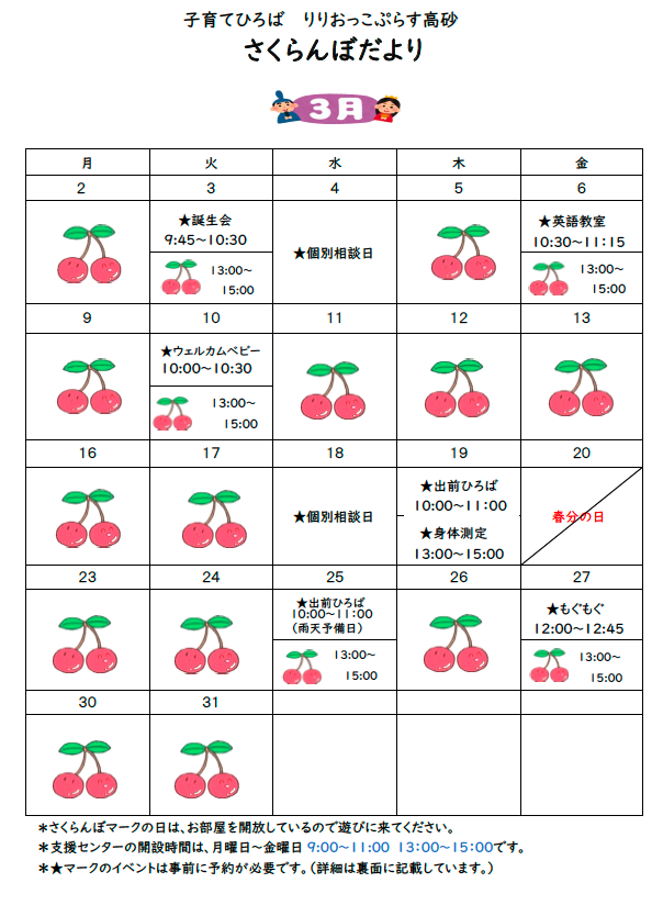 さくらんぼだより・イベントカレンダー【2026年3月号】を更新しました。 お知らせ さくらんぼだより 2026.02.24 さくらんぼだより・イベントカレンダー【2026年3月号】を更新しました。 pdfはこちらからご覧ください。 SHARE TWEET LINE